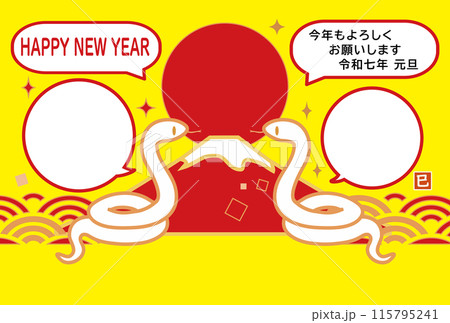 新年賀卡模板,配有蛇和富士山插圖,帶相框框架2025年新年賀卡水平