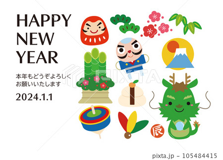 2024 年龍年 - 帶有日本新年圖示的水平新年賀卡