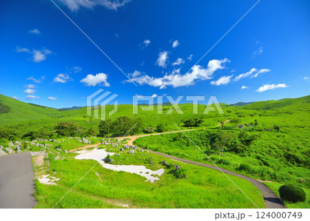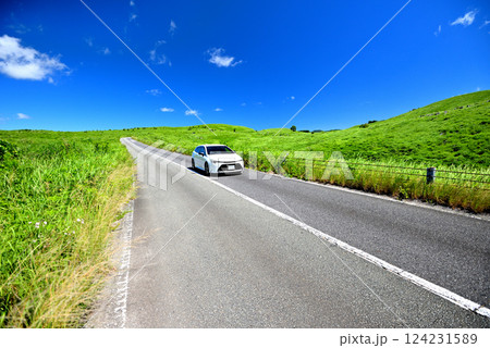 中國地方、秋吉台、藍天與草原的駕駛路線、山口縣宮市秋吉台喀斯特道路(1)