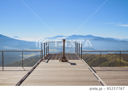 山梨縣山梨市乾山月見岩附近兩名女登山客眺望富士山的後景