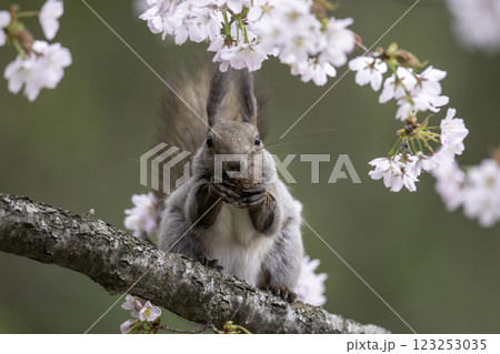 一隻北海道松鼠站在櫻花樹上