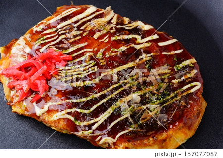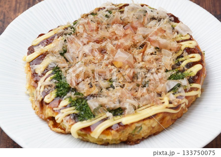 盛在白盤子裡的御好燒(魷魚和雞蛋)