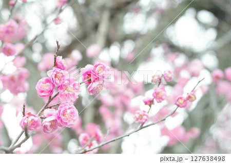 整齊可愛的淡粉紅色紅梅樹盛開,預示著新年的到來。