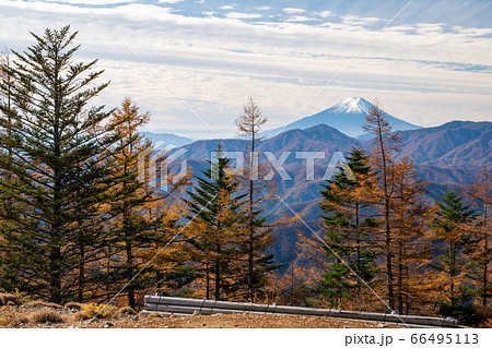 從富士斯巴魯線看到的富士山和落葉鬆的黃葉 十月 富士山 587 從富士斯巴魯線看到的紅葉