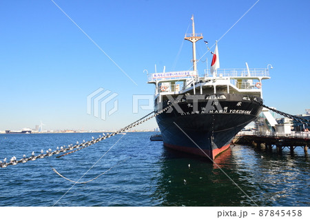 停泊在橫濱山下公園的日本郵輪冰川丸的景色。