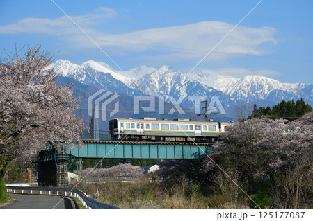 飯田線:213系列5000型列車,以中央阿爾卑斯山為背景,盛開著櫻花