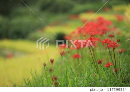 在稻田的山脊上綻放的簇狀孤挺花