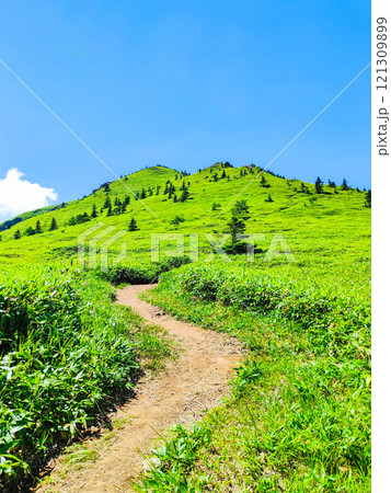 奈良縣宇田郡索尼村秋季索尼高原上生長的蒲葦和步行道