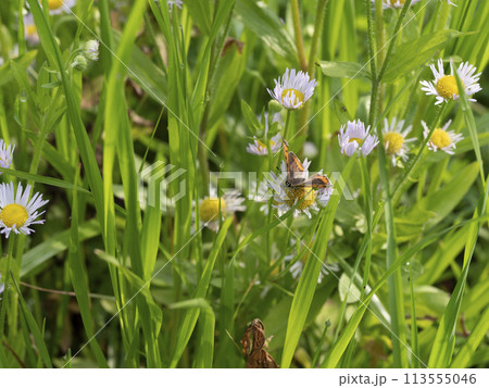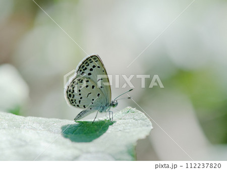 盛夏的早晨,一隻蜆在款冬葉的側面沐浴著陽光,正準備飛走。