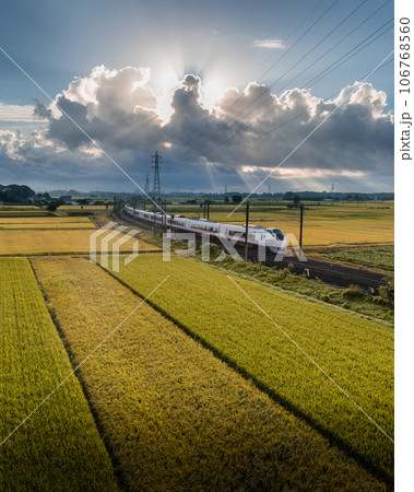 茨城縣水戶市常磐線穿過秋天的稻田