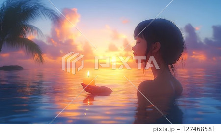 Serene Sunset Ritual: Woman Holds Lit Candle in Tropical Ocean W