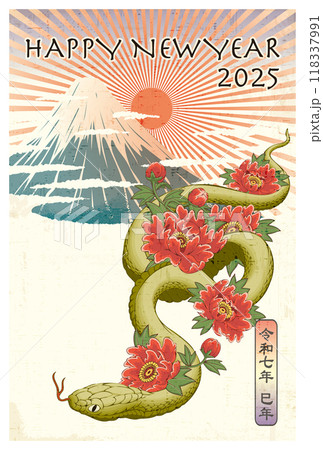2025新年賀卡模板「Hanahebi和Fuji」新年快樂圖案附英文註釋
