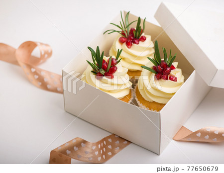 Delicious purple cupcakes with blueberry decoration on a rustic background in moody lighting
