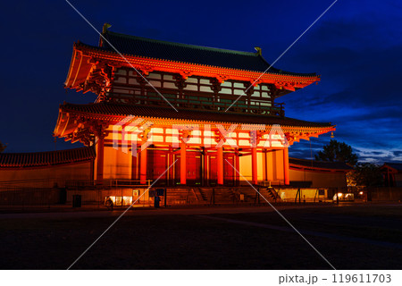 奈良平城京遺址朱雀門周圍的夜景中秋朱雀門在夜空的映襯下