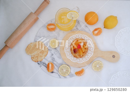 Stack of Portuguese sweet dessert egg tart or Pastel de Nata on white ceramic plate on white table. Copy space. Top view.