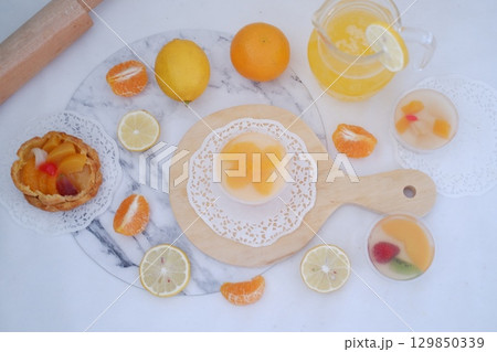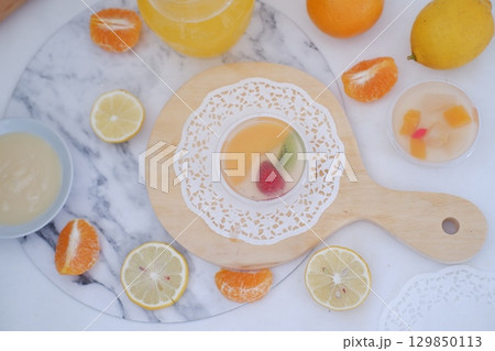 Tea with lemon, ginger, honey, and mint in a cup on a marble background with citrus fruits