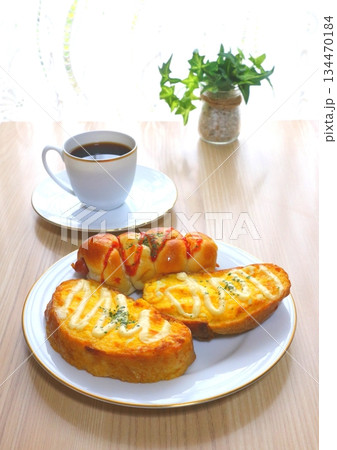 早餐(雞蛋法國和香腸捲)和咖啡 [垂直構圖]