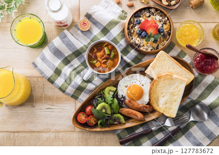 日本日式早餐形象(米飯、玉子燒、炸雞、泡菜、味增湯、土佐煮竹筍)