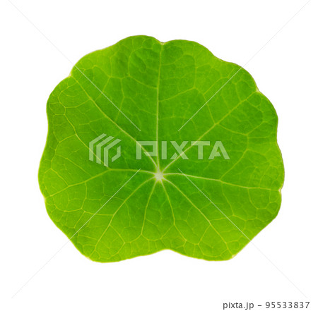 Small leaf of garden nasturtium from above, isolated on white background. Fresh green round leaf of Tropaeolum majus, nasturtian, nose-twister or nose-tweaker, a salad ingredient. Close-up food photo.