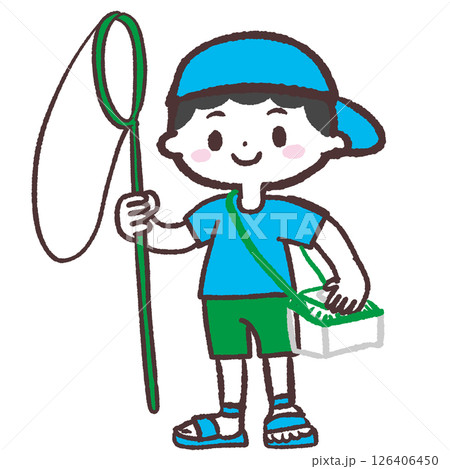夏天_開朗的男孩捉蟲子插畫【全身】