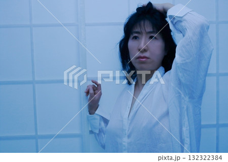 一名女子身穿白色長衫,沐浴後玩弄頭髮