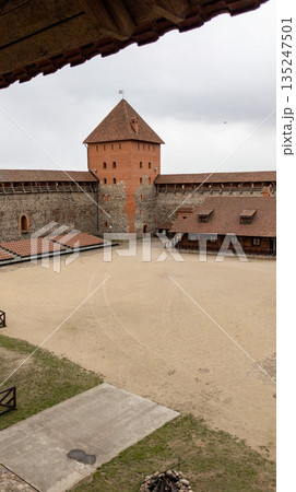 Tower and view of the courtyard of Lida Castle, Belarus. View from the balustrade of the medieval castle's courtyard.