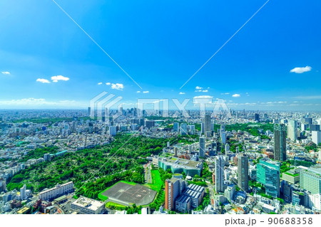 東京風光Ta地平線,藍天和綠色2020年9月從澀谷看大城市