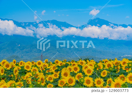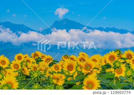 山梨縣北斗市明野向日葵田 盛開的向日葵田,藍天和群山上的雲彩