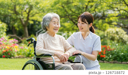 坐在輪椅上的老年婦女和微笑的護理人員