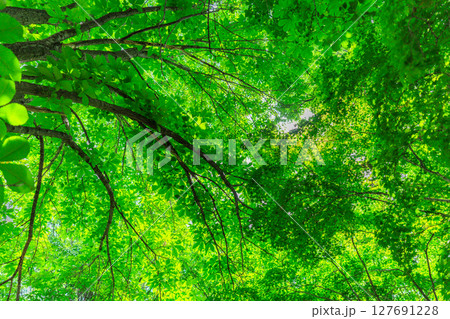 抬頭看著新鮮的綠樹