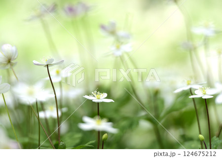 Blooming anemone nemorosa in a vibrant spring forest filled with lush green foliage and delicate white petals