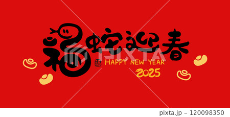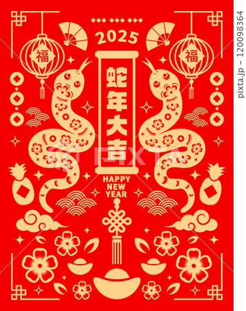 Chinese new year of cute cartoon snake and spring couplet. Chinese translation : Happy new year and Make a fortune