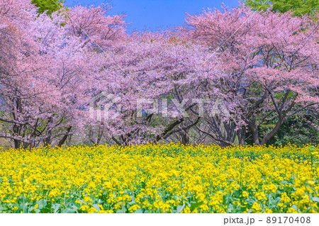 昭和紀念公園藍天映襯下的粉蝶花和櫻花樹