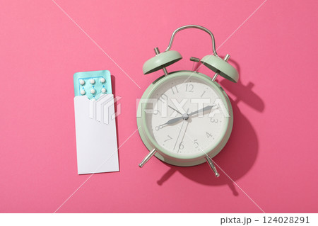 15 Hrs alphabet letters and alarm clock top view on pink background