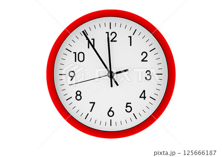 Red watch, wall clock 11 hours 45 minutes on isolated or white background