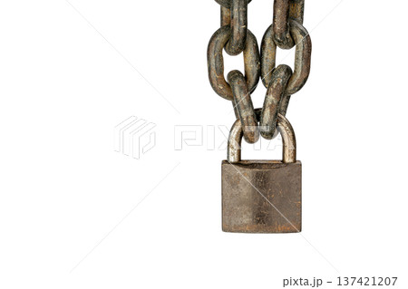 Close-Up of a Sturdy Weathered Metal locked Padlock Secured with Heavy Rusted Chain Links on Isolated White Background