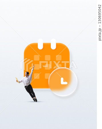 Minimalist collage. Happy woman jumping with folder near digital calendar and clock icons