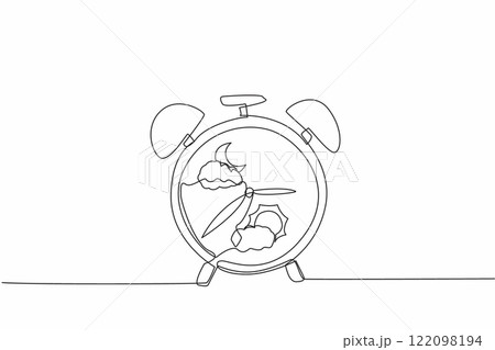 Single one line drawing alarm clock which has a picture of a cloudy crescent moon and a picture of a cloudy sun. Circadian rhythm. Biological Clock Day. Continuous line design graphic illustration
