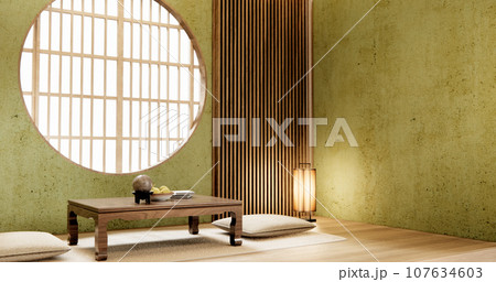 Japanese traditional low table and decoration on minimal muji room japan style.3D rendering