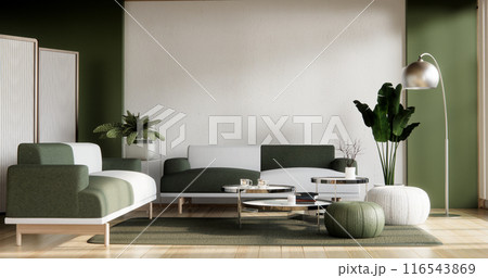 green design in modern living room with black low table ,lamp,vase, and decor Japanses style.