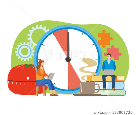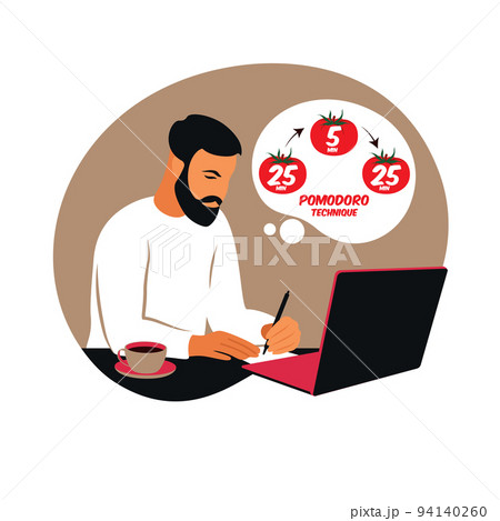 Man manager working with computer using time management. Pomodoro technique concept. Vector. Flat.
