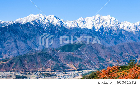 長野縣安曇野市,在晴朗的秋天從長峰山頂眺望北阿爾卑斯山(11月)
