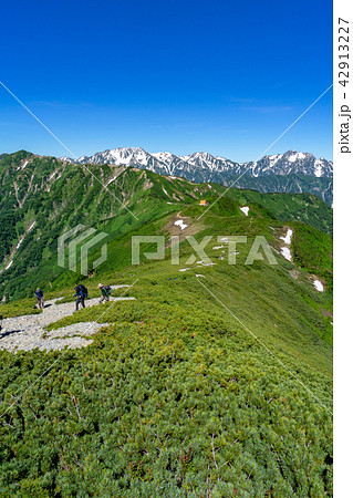 北阿爾卑斯山、芝嶽山頂、登山者和尾跡