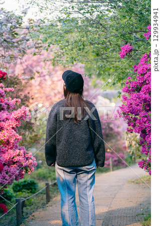 足利花卉公園:一位女子漫步在杜鵑花和重瓣櫻花之間
