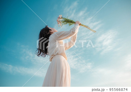 一個穿著白色連衣裙的女人在藍天下捧著鮮花