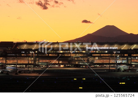 以富士山為背景的羽田機場,以及在夕陽映照下亮燈的3號航廈
