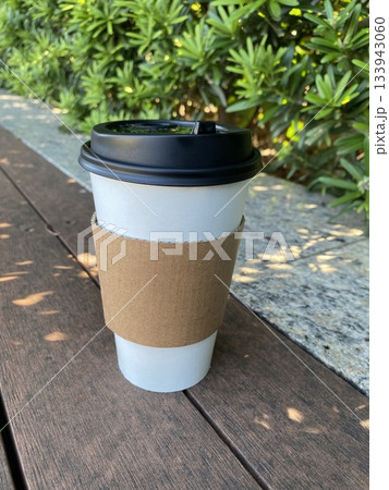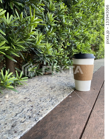 White paper coffee cup on wooden deck beside hedge