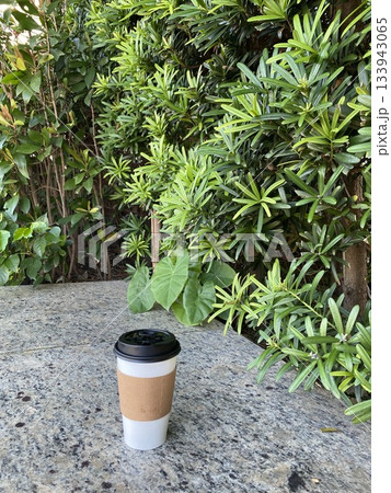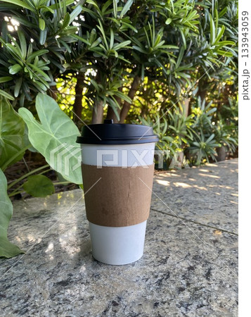 coffee cup on stone table with green foliage