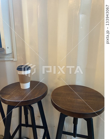 coffee cup on wooden stool in minimalist cafe shop