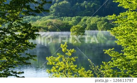 晨霧中的中禪寺湖,千手浜秋林中的南台山